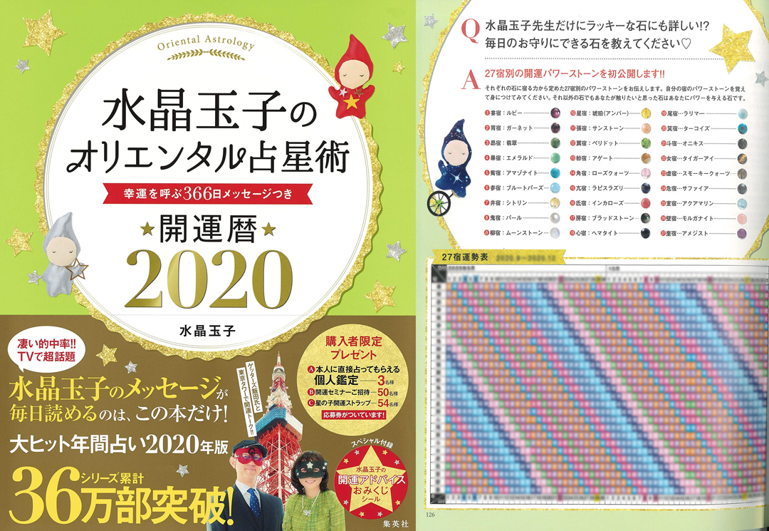 2019.10.02 「水晶玉子のオリエンタル占星術 幸運を呼ぶ366日メッセージつき 開運暦2020」に、マルラニハワイのパワーストーン画像が掲載されました。