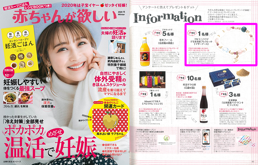 2019.11.24 雑誌 「赤ちゃんが欲しい2020冬号」に、「Mother Earth」が掲載されました。「Mother Earth」の詳細はこちら